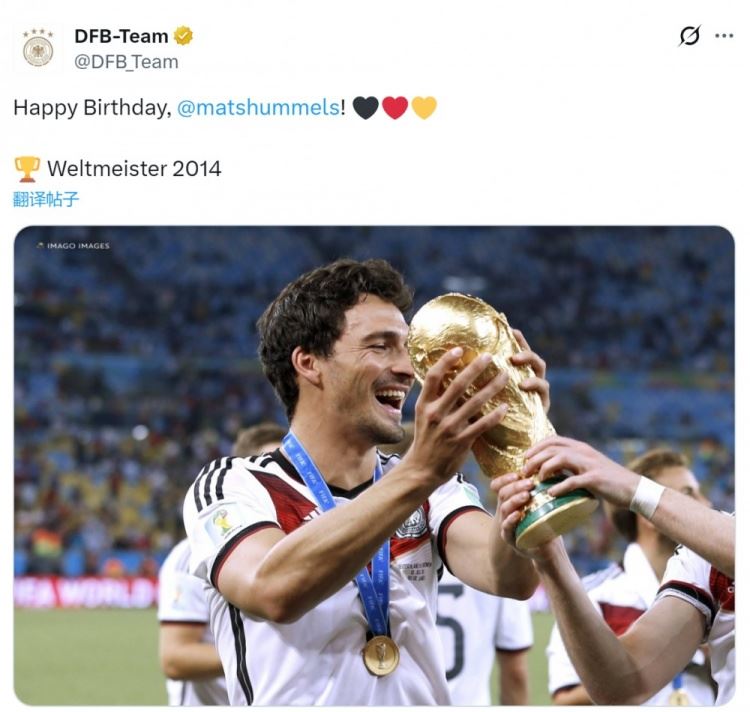 德国队祝胡梅尔斯37岁生日快乐,国家队出战78场+问鼎世界杯