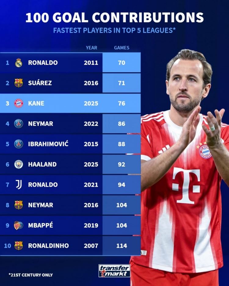 本世纪五大联赛最快参与100球排名:C罗居首,苏亚雷斯、凯恩前三
